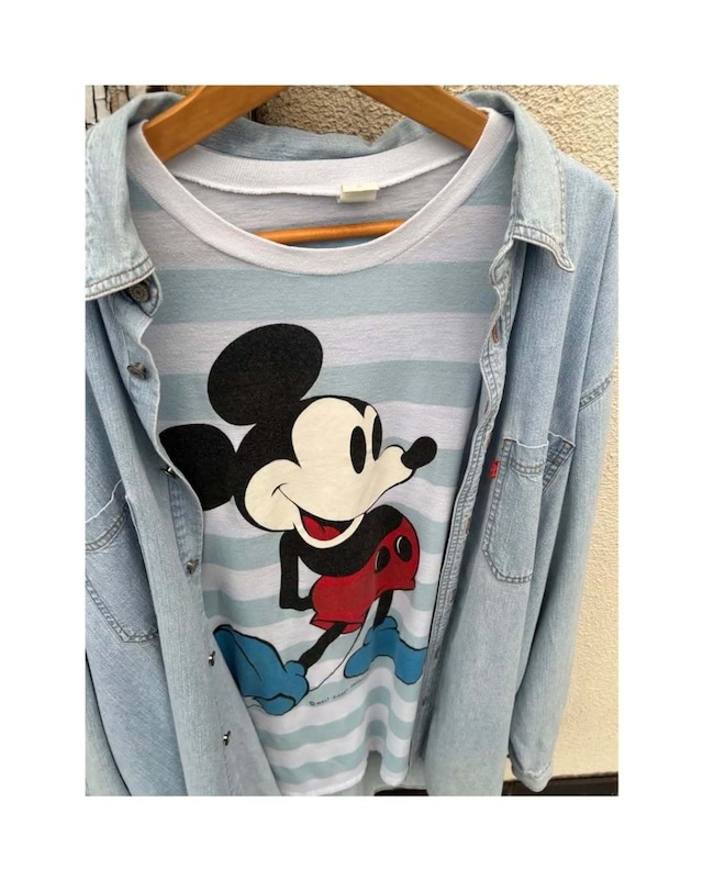 80's〜 "Mickey Mouse" border print tee shirt size ONE SIZE 肩幅56.5cm 身幅52cm 袖丈16.5cm 着丈75cm 古いミッキーTシャツ 爽やかなブルー×ホワイトのボーダー 靴がブルーの珍しいミッキープリント 近年価格も高騰して人気なアイテム 人気であることを差し引いてもプリントも可愛くてインパクトあります 可愛いからこそ是非メンズに着たもらいたいTシャツ 子供っぽくならないので是非