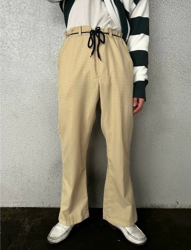【Dickies】 Asymmetry Design Easy Pants Good Color size ウエスト94(ドローコードで調節可能) 股上34.5 股下71 裾幅27.5cm程 179cm着用 ・ Dickiesのイージーパンツ アシンメトリーなペインターパンツデザイン ワイドストレートで薄手のコットンポリ生地 コーデを考えるのが楽しいライムグリーンカラー 春夏って色物パンツ履きたくなります イージー仕様なのでストレスのない履き心地 足元は革靴やボリュームのあるスニーカーで、トップスには 同系色のチェックシャツなんかおすすめです
