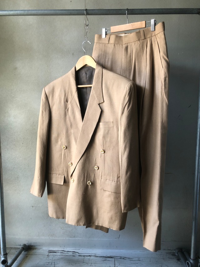 size (肩幅48.5cm 身幅56cm 袖丈60cm 着丈75.5cm) (ウエスト76cm 股上30cm 股下77.5cm 裾幅19.5cm) 2ピースのセットアップ。 ジャケットのデザインはダブル。6つボタン1つ掛け仕様。 パンツは2タック入って、程よくテーパードがかかるオーソドックスなシルエット。 生地はかすり生地のような風合いで雰囲気抜群。 単体使いもしやすいかと。 どこか50'sな雰囲気漂うかっこいいセットアップ。 サイズの合う方は是非。 左袖付近に薄いシミがございますが目立ちません。 こちらの商品は「Yolo VINTAGE&USED STORE」でのお取り扱いとなります。 住所 : 福岡県北九州市小倉北区京町1-5-15 TEL:093-383-9889 Instagram : yolo_kokura お問い合わせは上記までお気軽にどうぞ。 ※こちらの商品は古着となりますので返品、交換の対応を致しかねます。また、ダメージや汚れ等を理由とした返品、交換も対応致しかねますので、細かな点が気になる方はメール、直接店頭までご連絡の上購入をお願い致します。