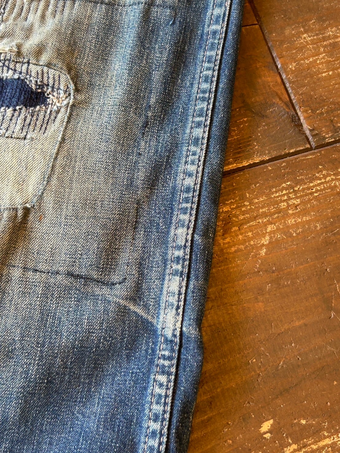 濃淡のある荒々しい色落ちやリペア痕、ポケット部分のダメージなど、リアルワークの雰囲気抜群なアートピース