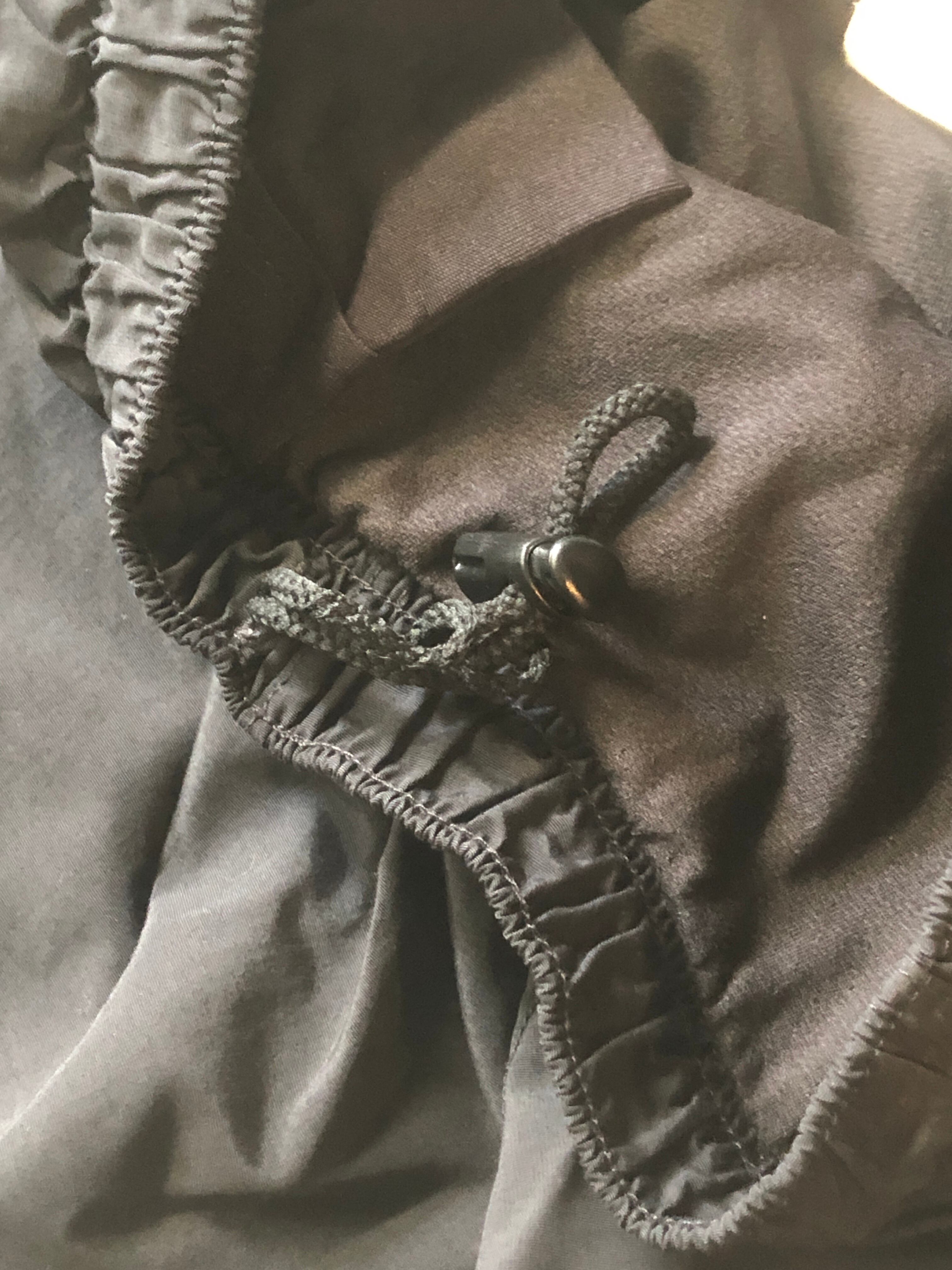 ウエストはゴムシャーリングで伸縮し、ストッパー付きのドローコードも備わっています。