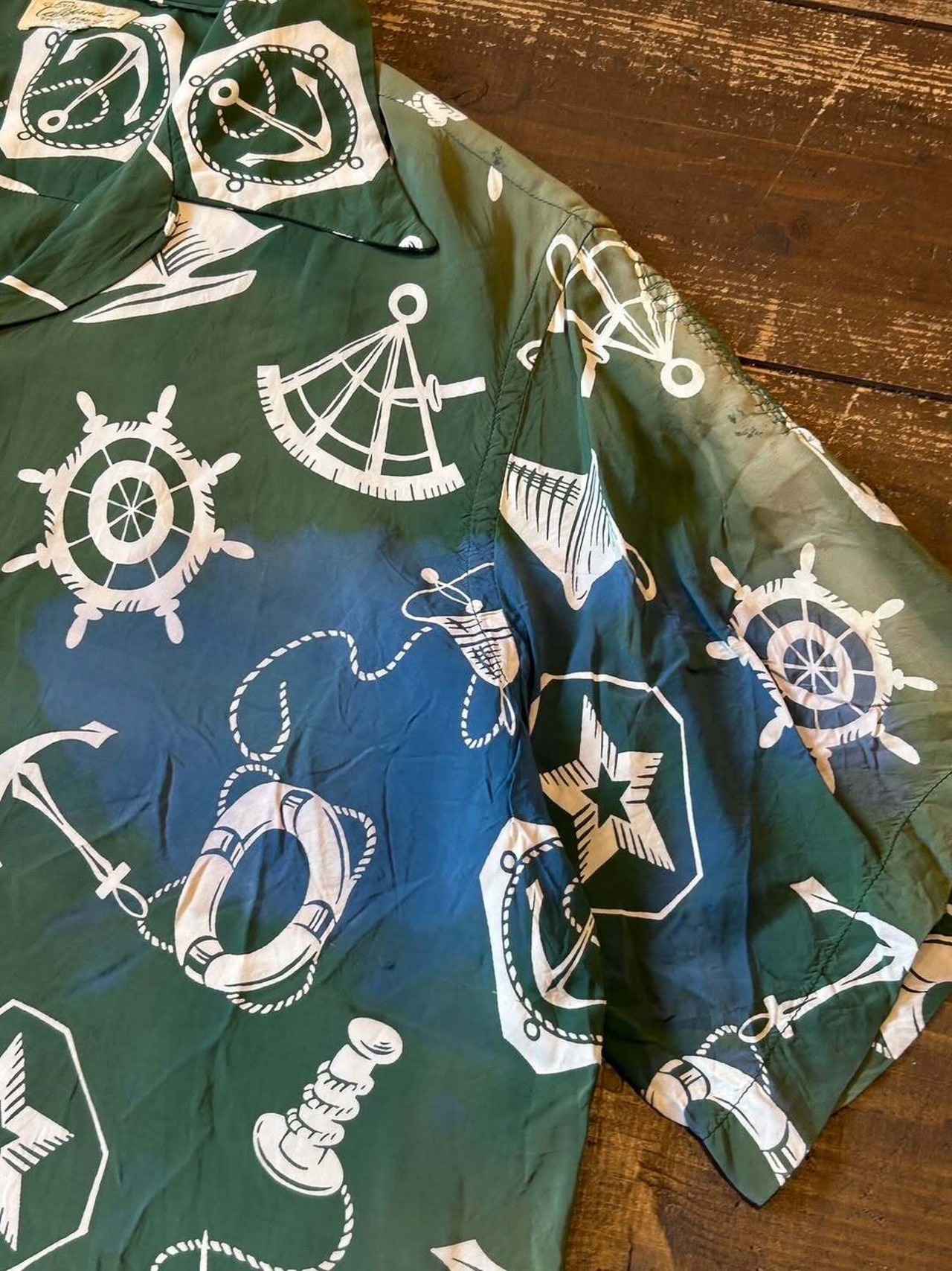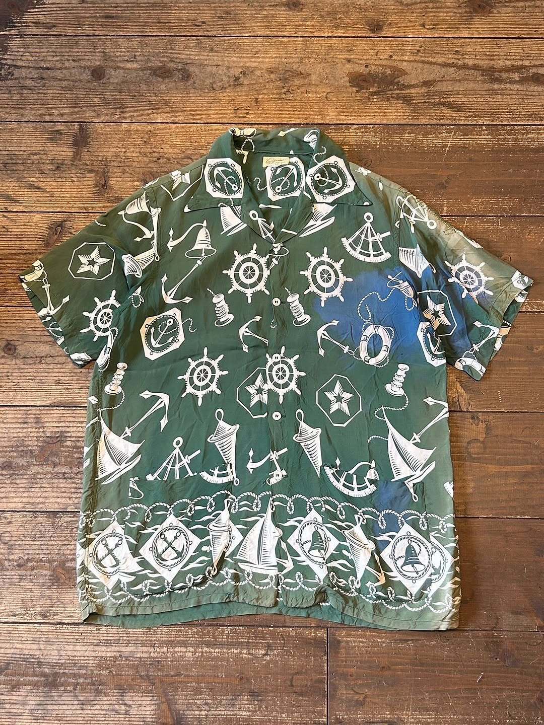 1940~50年代頃、目を惹く総柄の半袖レーヨンシャツ。