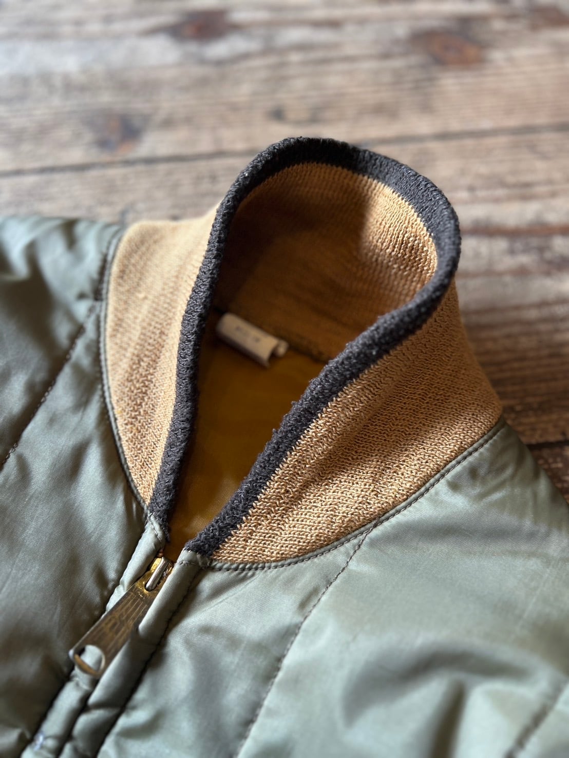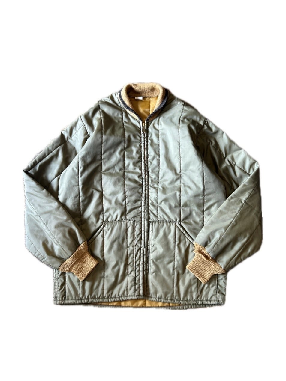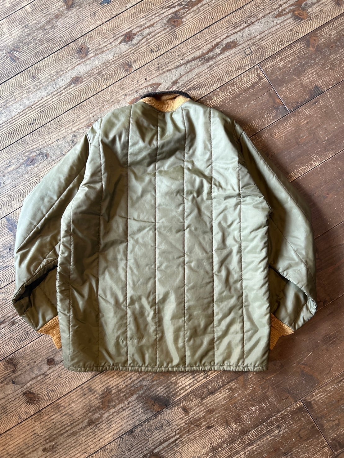 オリーブのボディにマスタードイエローのリブに裏地
