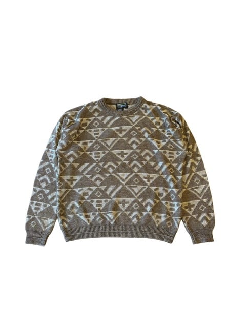ブラウン基調のカラーに規則的な幾何学模様がデザインされたお洒落ニット