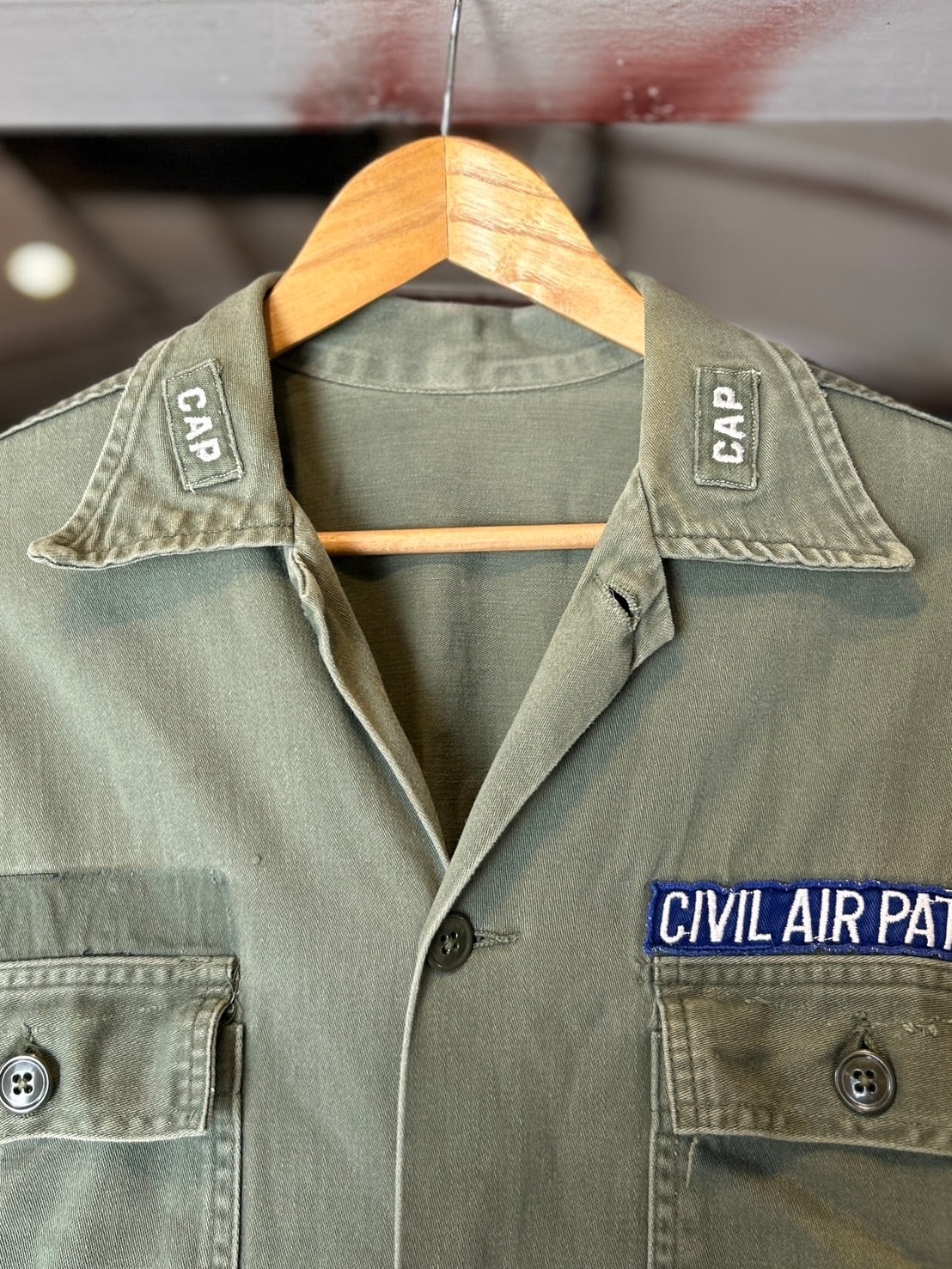 襟、胸ポケ上、左袖にはワッペン付き