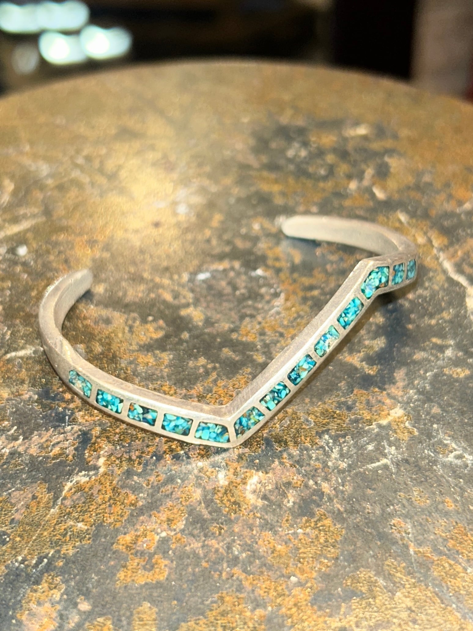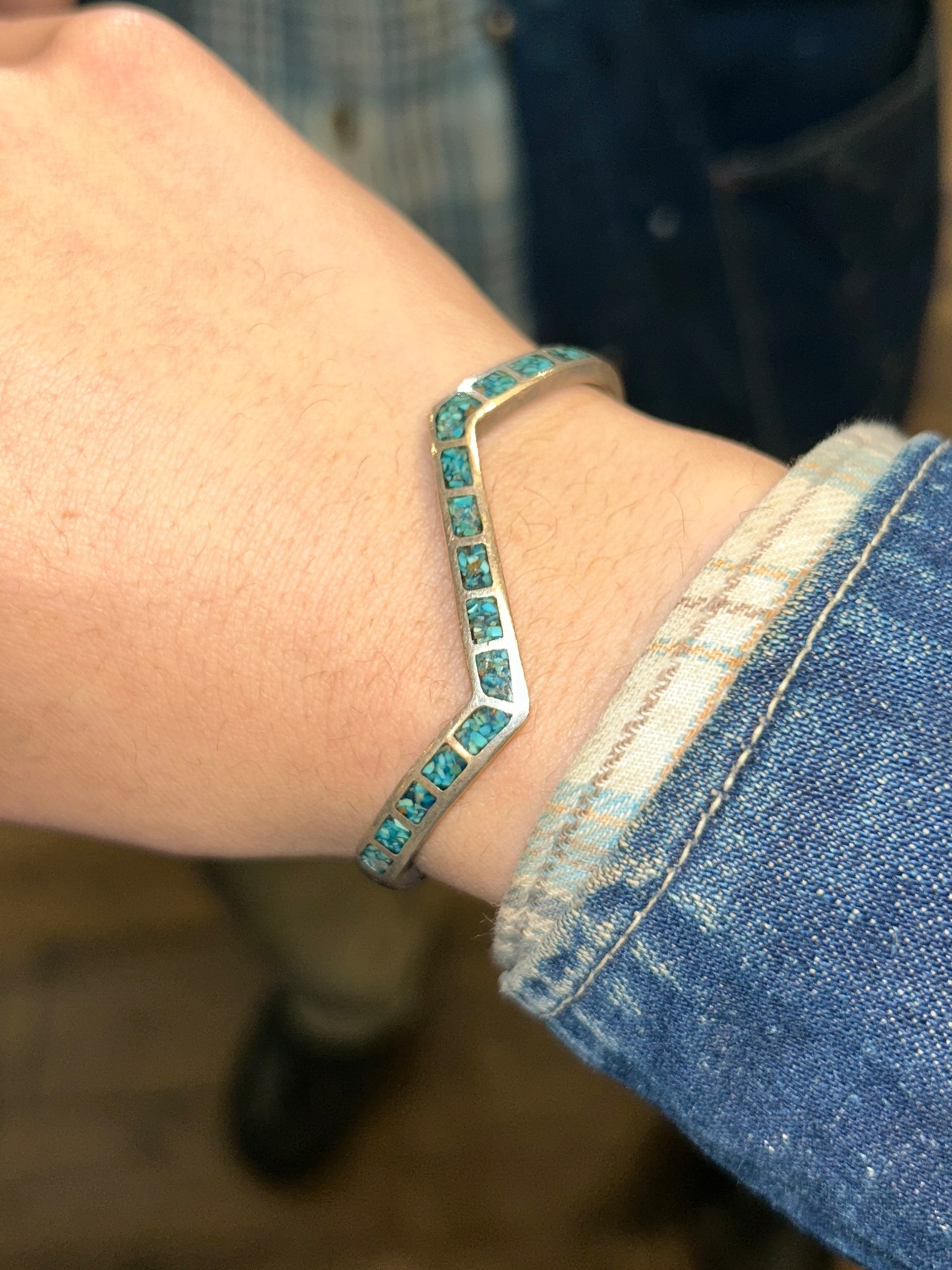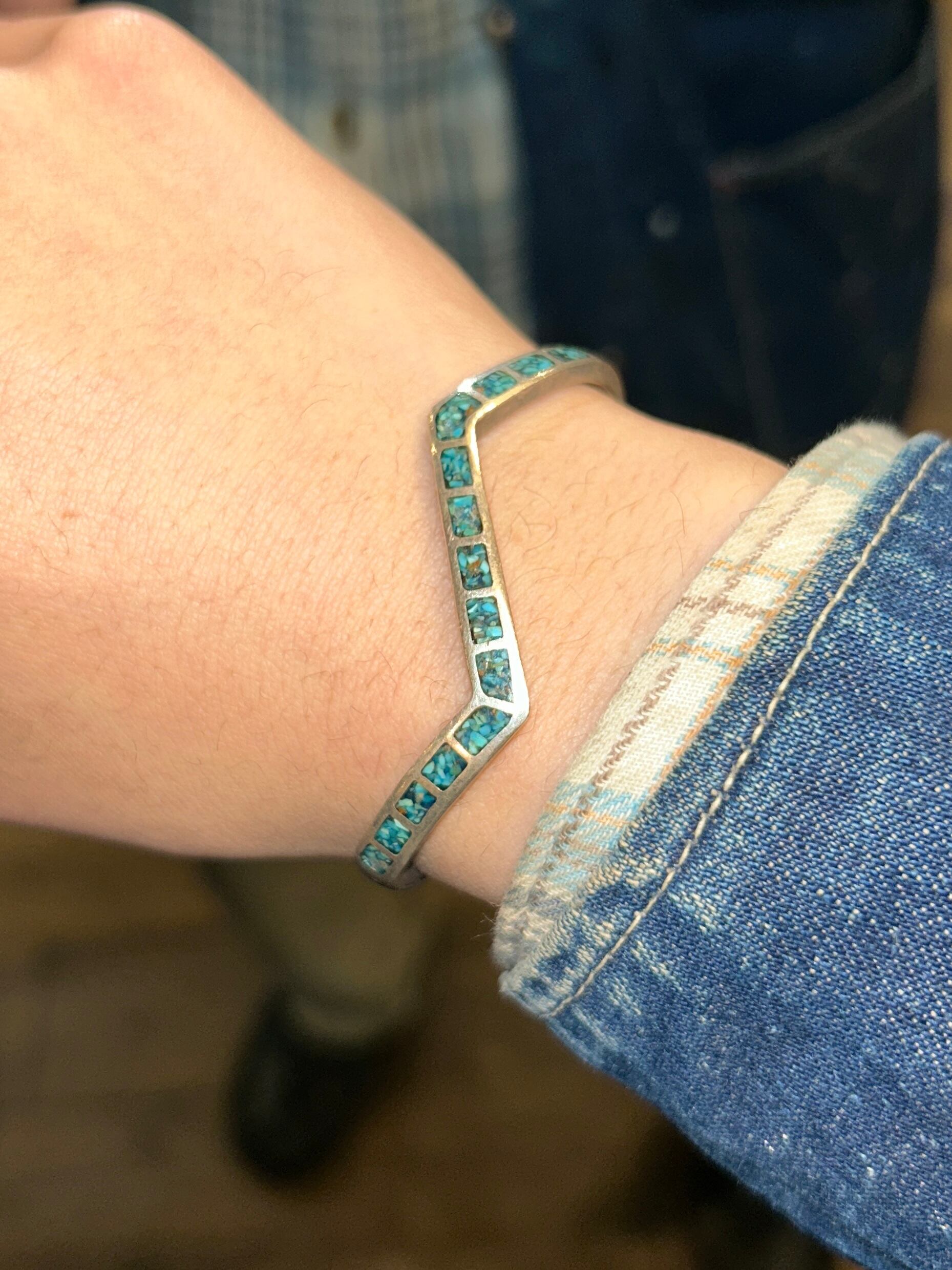 細身のシルバーにターコイズが埋め込まれた洒落たデザイン