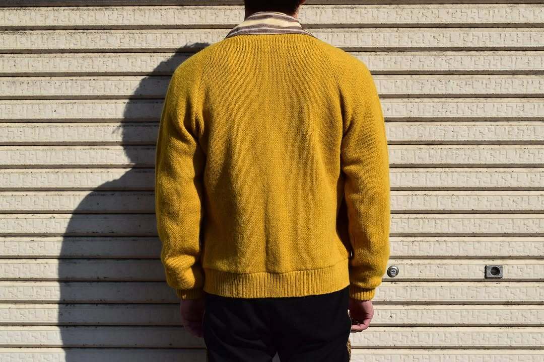 ケーブル編みされたマスタードカラーのボディにブラウンスエードの切り替え仕様