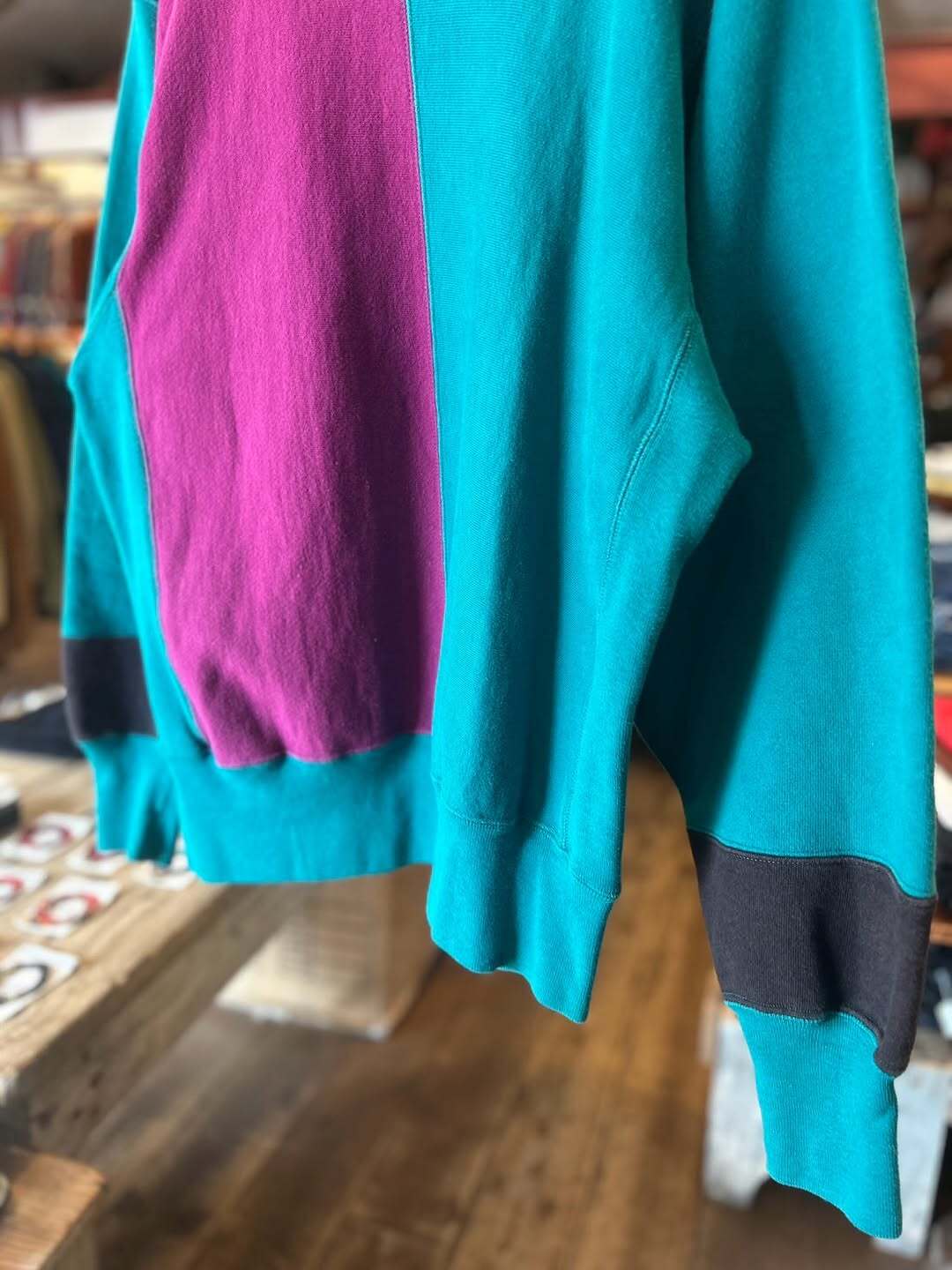 エメラルドグリーンにパープル、袖先にブラックの3トーン