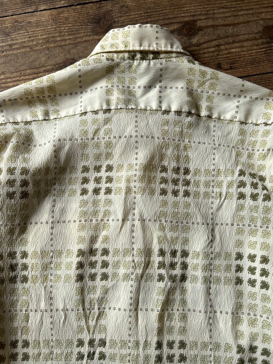カラーの異なるリーフ柄でチェックを表現した70年代らしさのある総柄シャツ