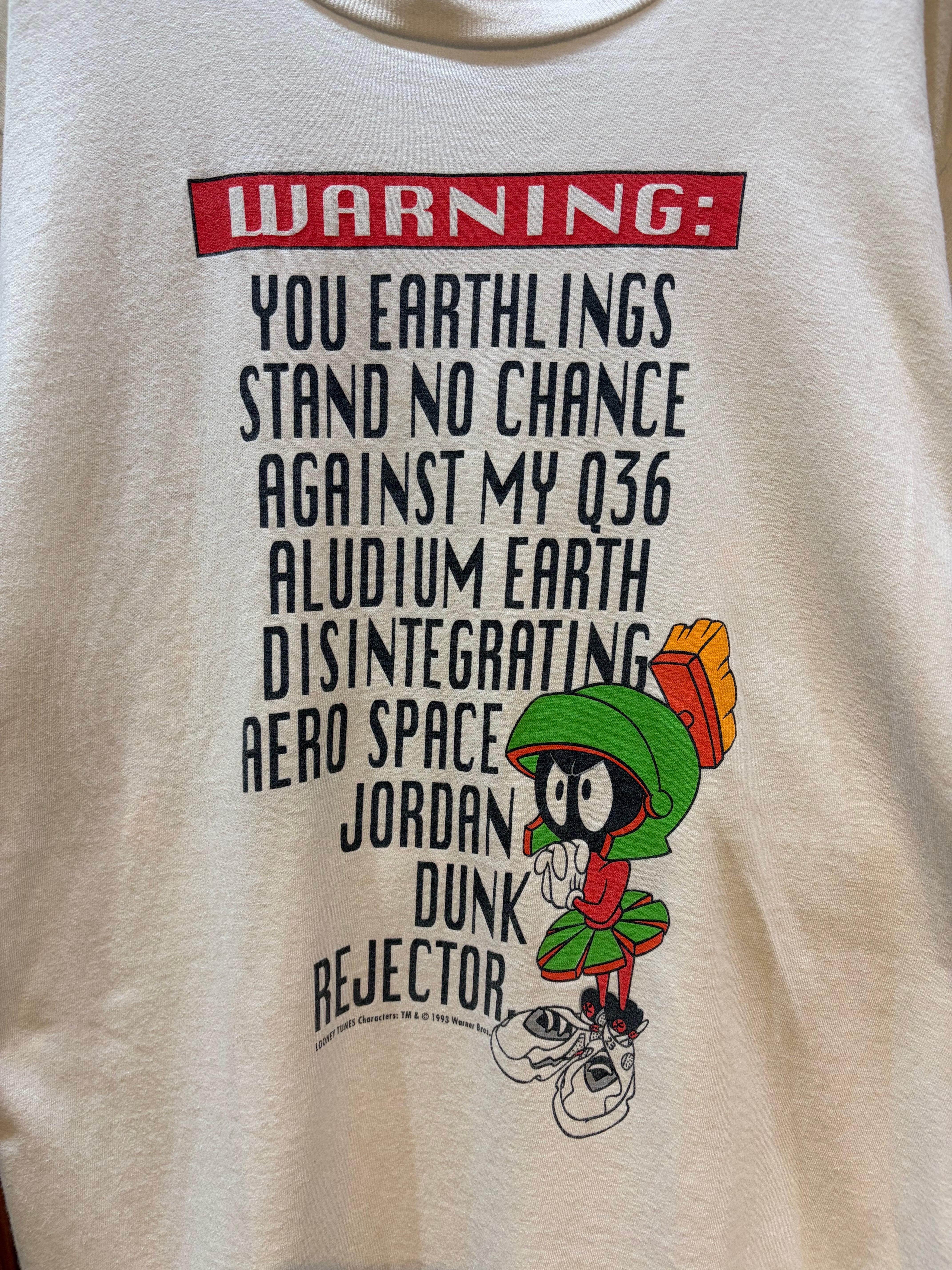 フロントには「ジョーダン・ダンク・リジェクター」だと発言するマービンがプリントされ、バックには空飛ぶ乗り物に乗ったマービンがジョーダンの圧倒的なダンクを目の当たりにして驚いている様なデザインがプリントされたユーモアのある一着